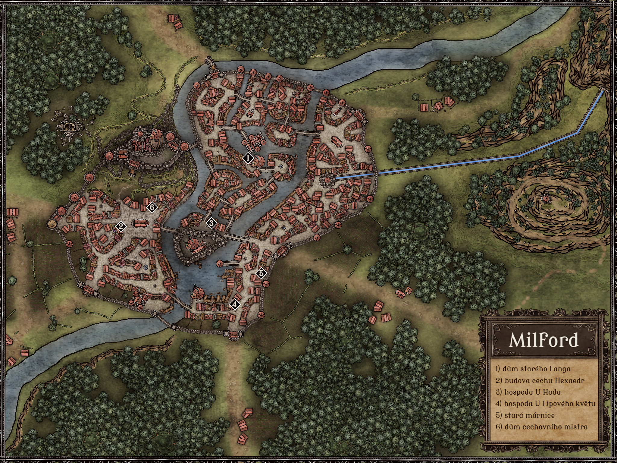 Překreslená mapa Milfordu z dobrodružství Lektvar z Laumspuru